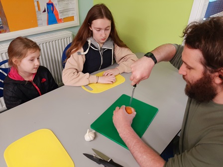 The HAF activity for young people in South Lakes involved a group aged 5-11 busy preparing their own lunch of home made soup and pancakes – yum!