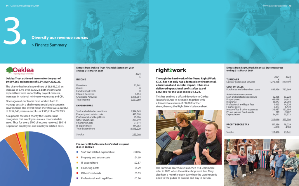 Our 24 page Annual Report for 2023-24 is now available to download. It reflects some of what we have done across the organisation (Oaklea and community enterprise, Right2Work CIC) and what is planned in the future.