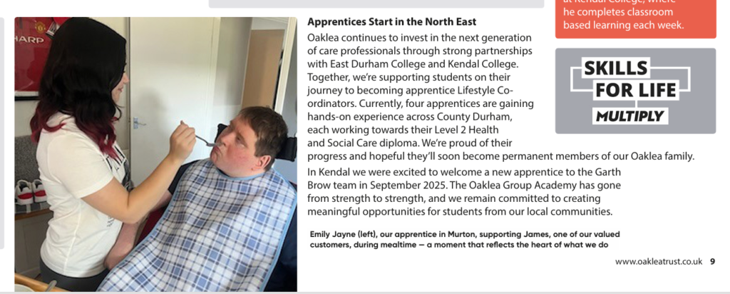 Paige, joined the Academy in April 2024. She had a long-standing passion for the sector and had been seeking a career in Health and Social Care since leaving school. After reaching out to Oaklea to enquire about apprenticeship opportunities, she was invited to an interview and was successfully appointed as an Apprentice Support Worker. To ensure the best quality training for Paige, Oaklea contacted East Durham College to provide the Health and Social Care apprenticeship framework that was right for her. Paige was then enrolled on a Level 2 Health and Social Care employment and became part of the team at one of Oaklea’s Supported Living services in Spennymoor.” Helen Shaw, HR Manager, Oaklea