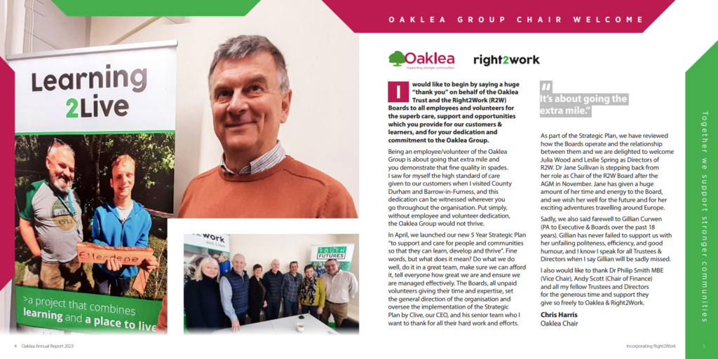 This week our Annual Report landed in physical form – it’s a departure from past Reports in that we have combined Oaklea Trust with our CIC Right2Work.